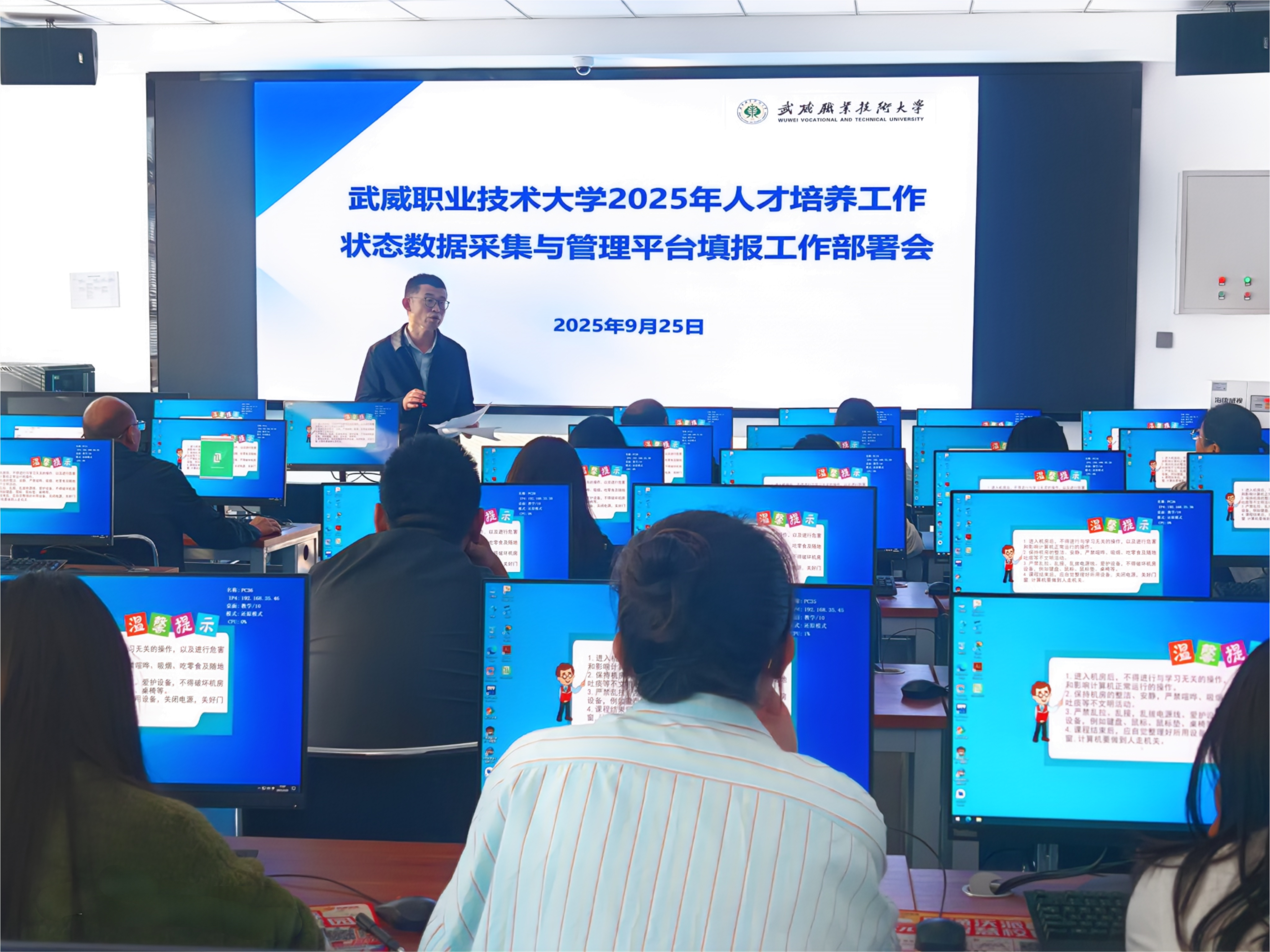 為深入貫徹落實教育部職成司《關于做好職業教育2024-2025學年數據采集工作的通知》精神,根據《甘肅省教育廳關于開展全省職業教育2024—2025學年信息數據采集工作的通知》要求,確保學校2025年人才培養工作狀態數據采集工作高效、有序開展。9月25日,教務處在篤行樓3樓機房組織召開學校2025年人才培養工作狀態數據采集工作部署會議。教務處、各學院(部)數據填報相關工作人員參加會議。