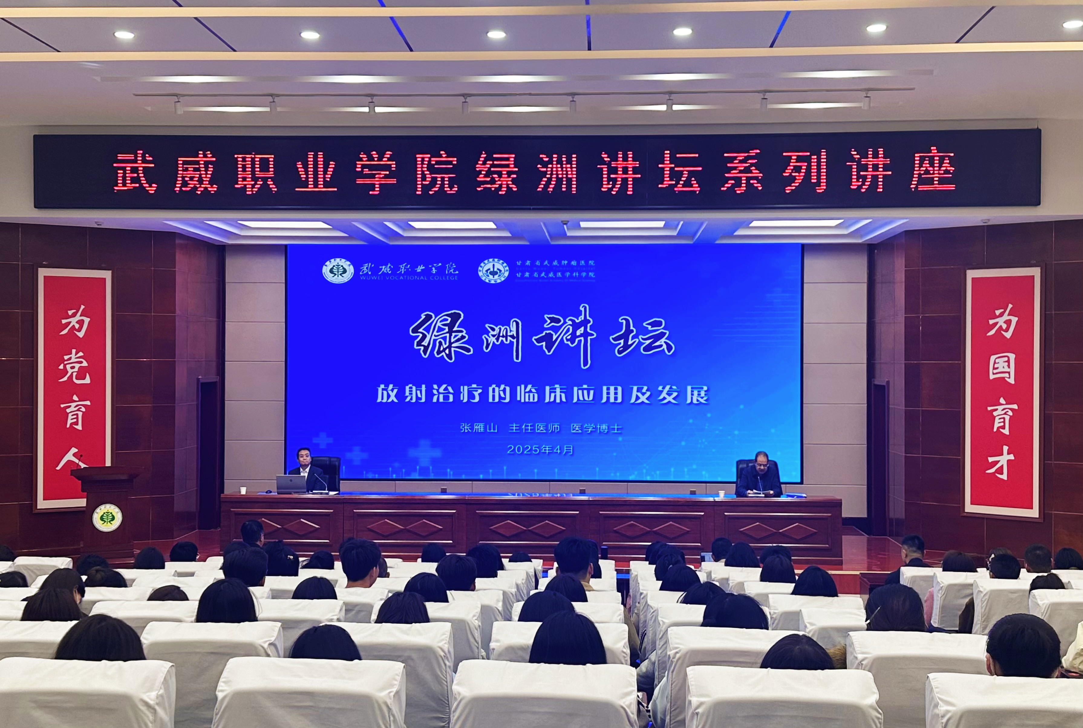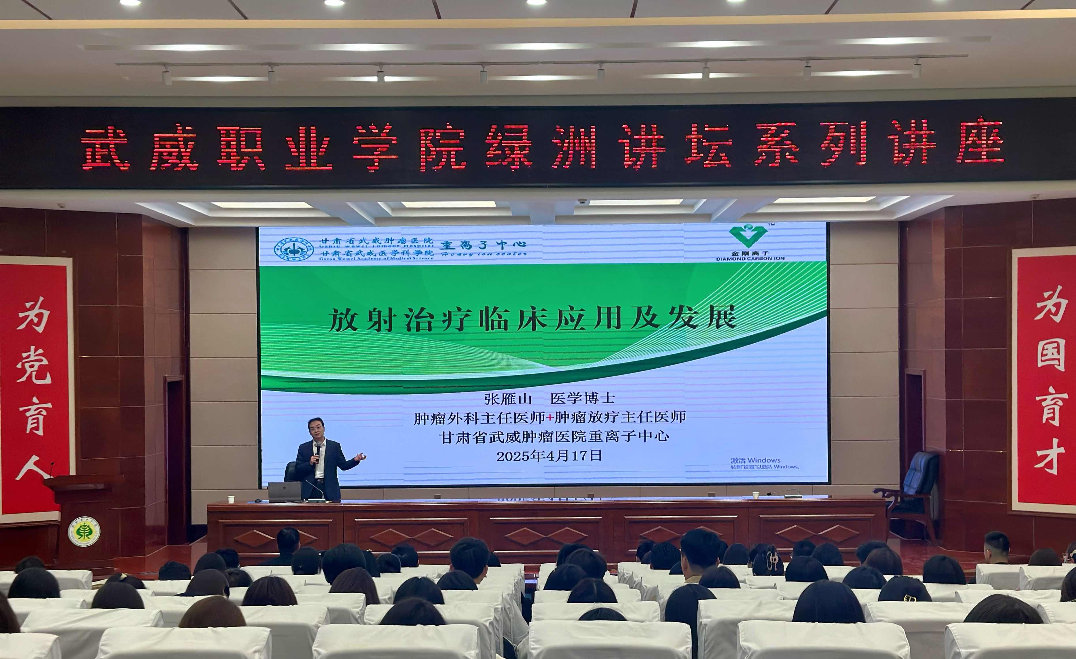 4月17日,學校特邀甘肅省武威腫瘤醫院副院長、重離子中心主任張雁山博士,在菁英廳作了“放射治療臨床應用及發展”專題講座。學校黨委副書記翟存祥主持講座,醫學技術學院、藥學院、護理學院教師,2024級放射治療技術專業學生共210余人聆聽了講座。
