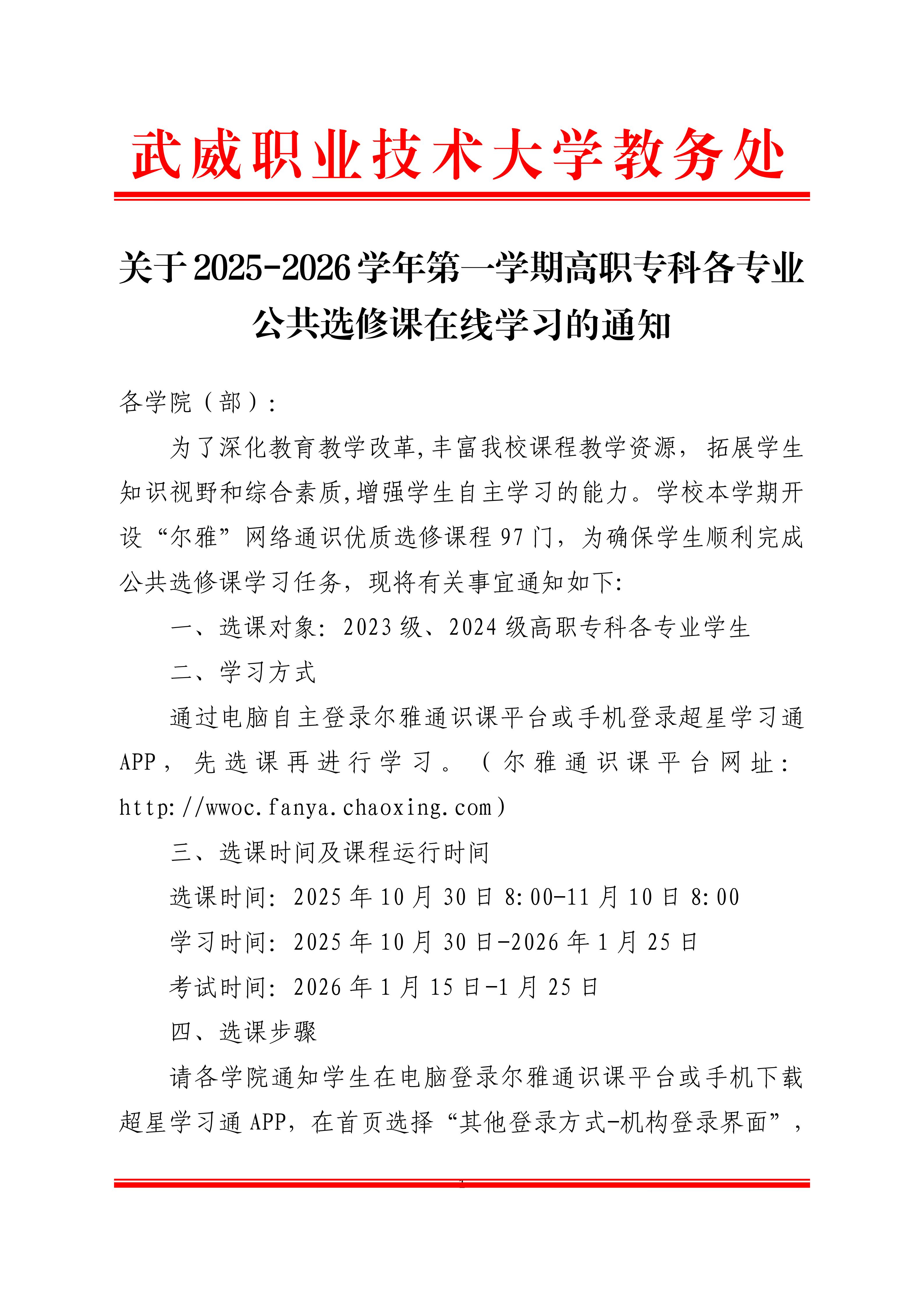 關于2025-2026學年第一學期高職專科各專業公共選修課在線學習的通知