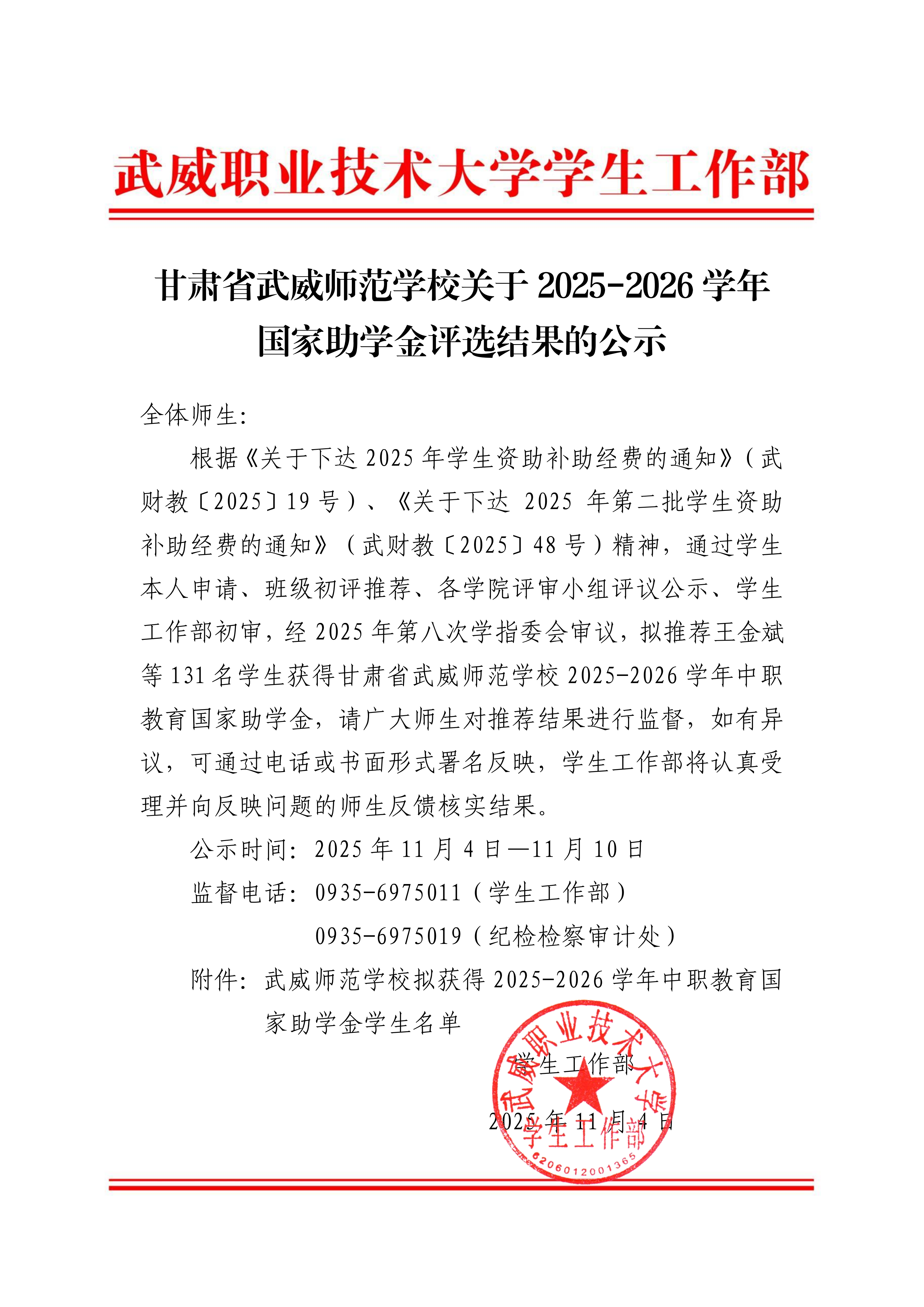 甘肅省武威師范學校關于2025-2026學年國家助學金評選結果的公示
