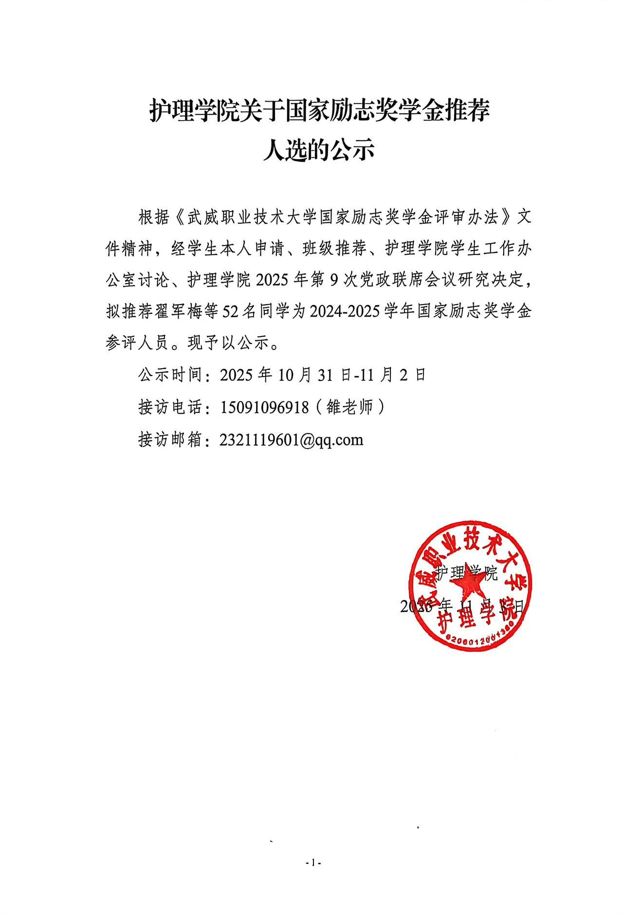 護(hù)理學(xué)院關(guān)于國(guó)家勵(lì)志獎(jiǎng)學(xué)金推薦人選的公示