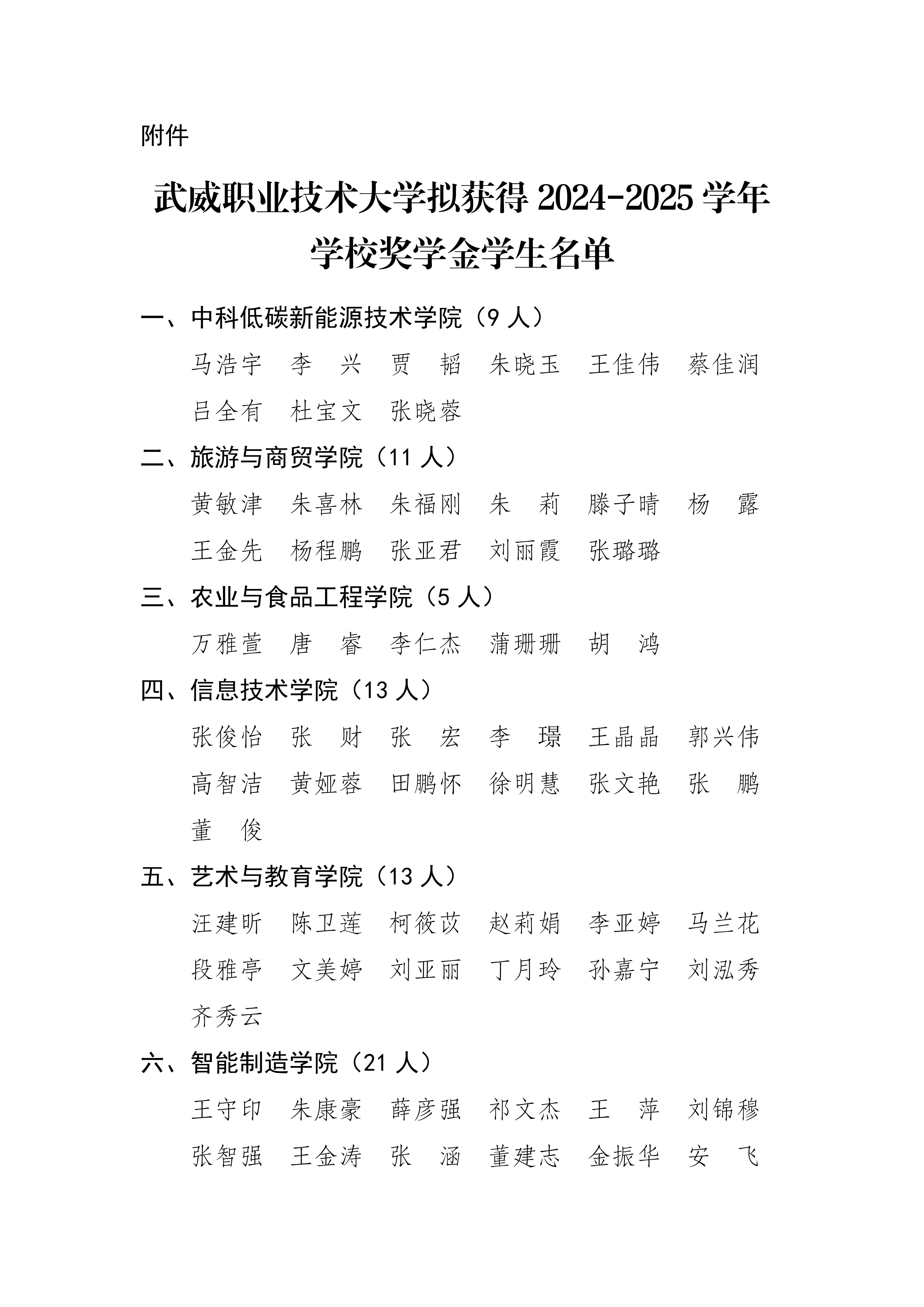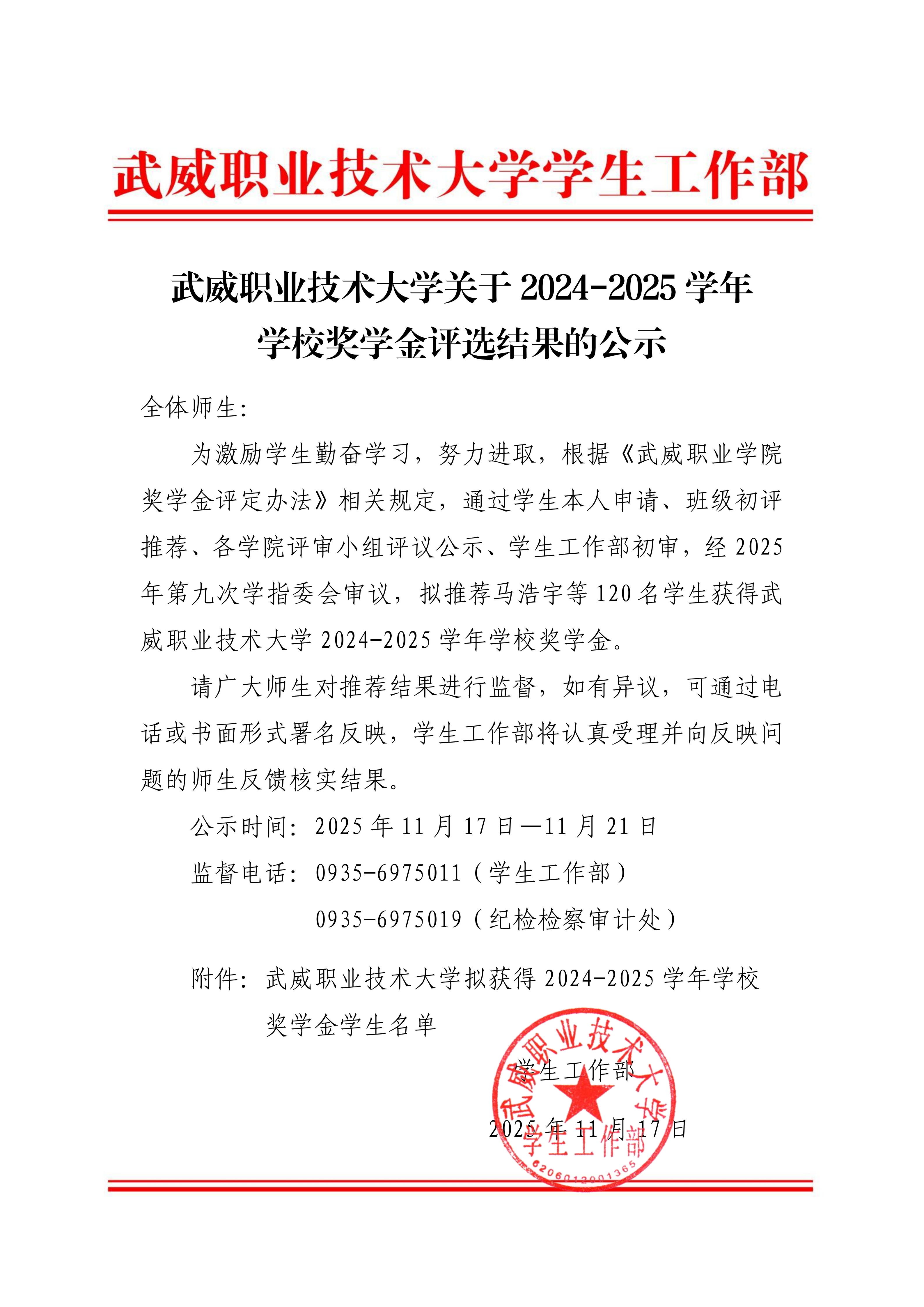武威職業技術大學關于2024-2025學年學校獎學金評選結果的公示