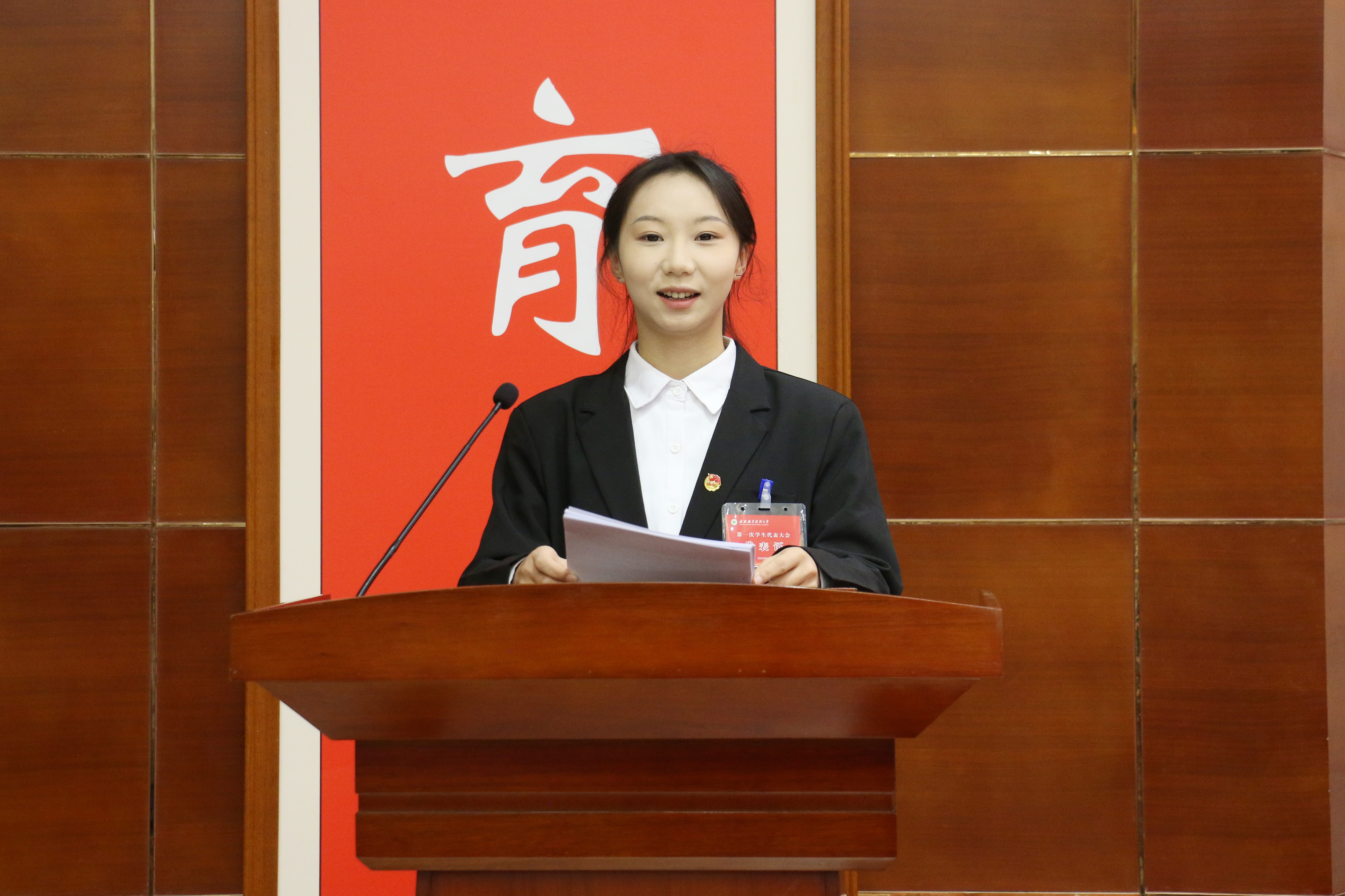 學校學生會主席團成員李悅同學代表第十一屆學生會委員會向大會作題為《奮楫篤行啟新程 挺膺擔當筑夢行,團結帶領廣大同學在建設特色鮮明的高水平職業技術大學中貢獻青春力量》的工作報告。