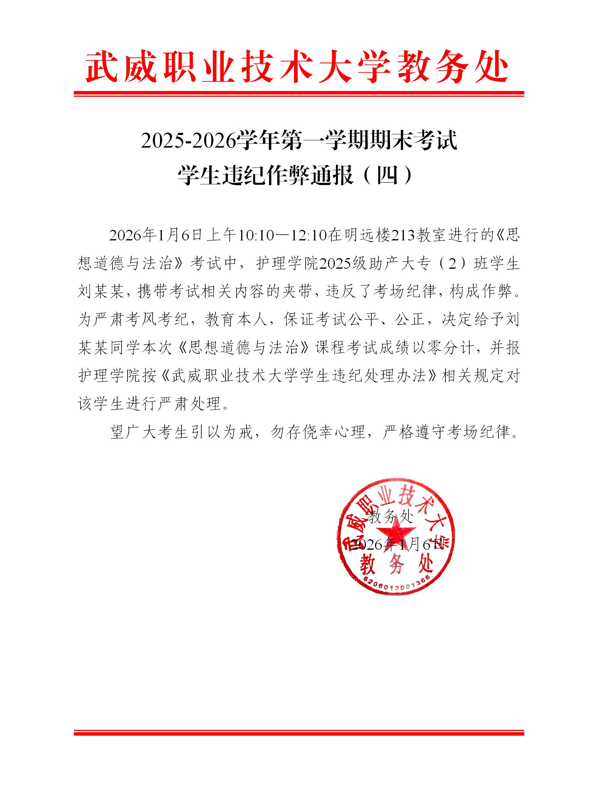 2025-2026學年第一學期期末考試學生違紀作弊通報(四)